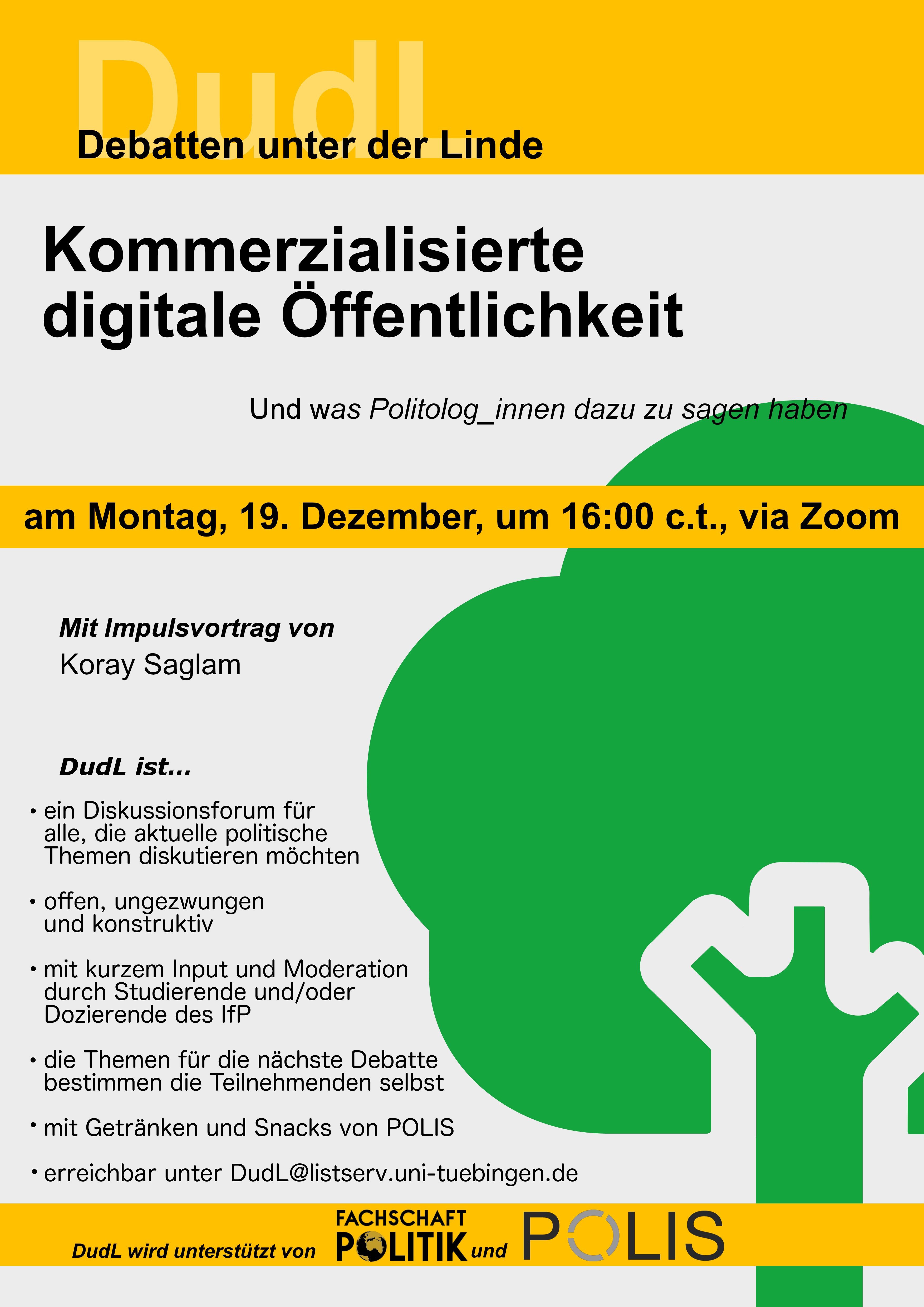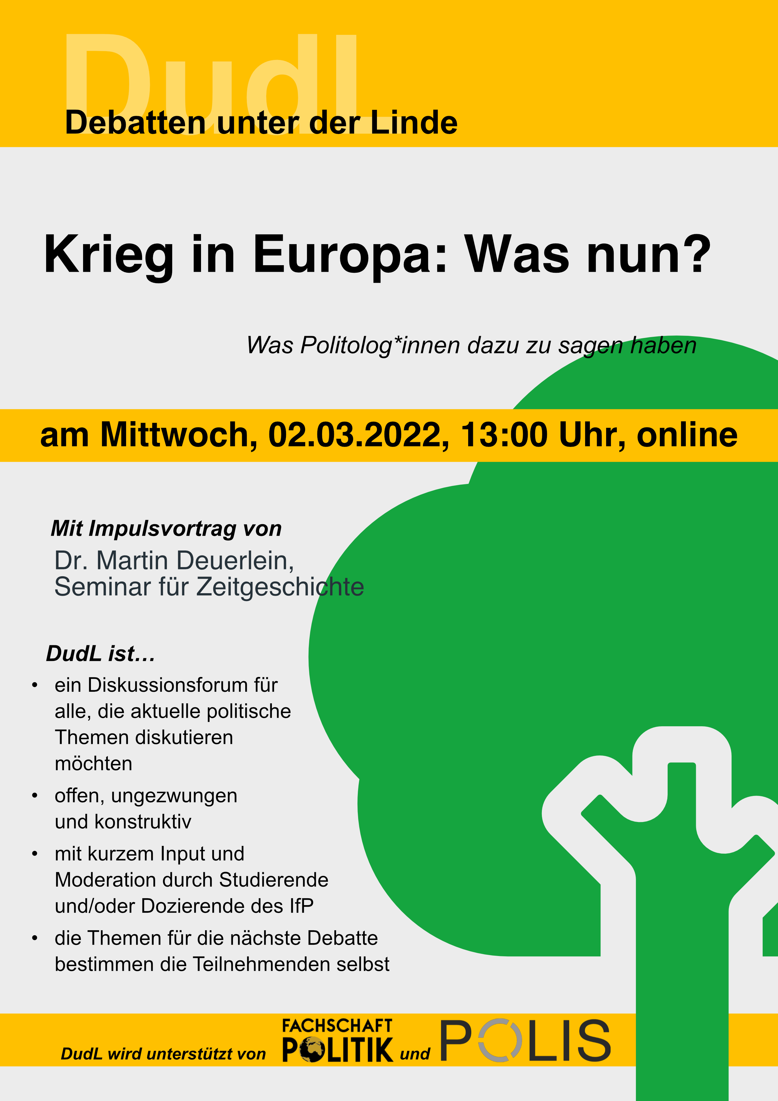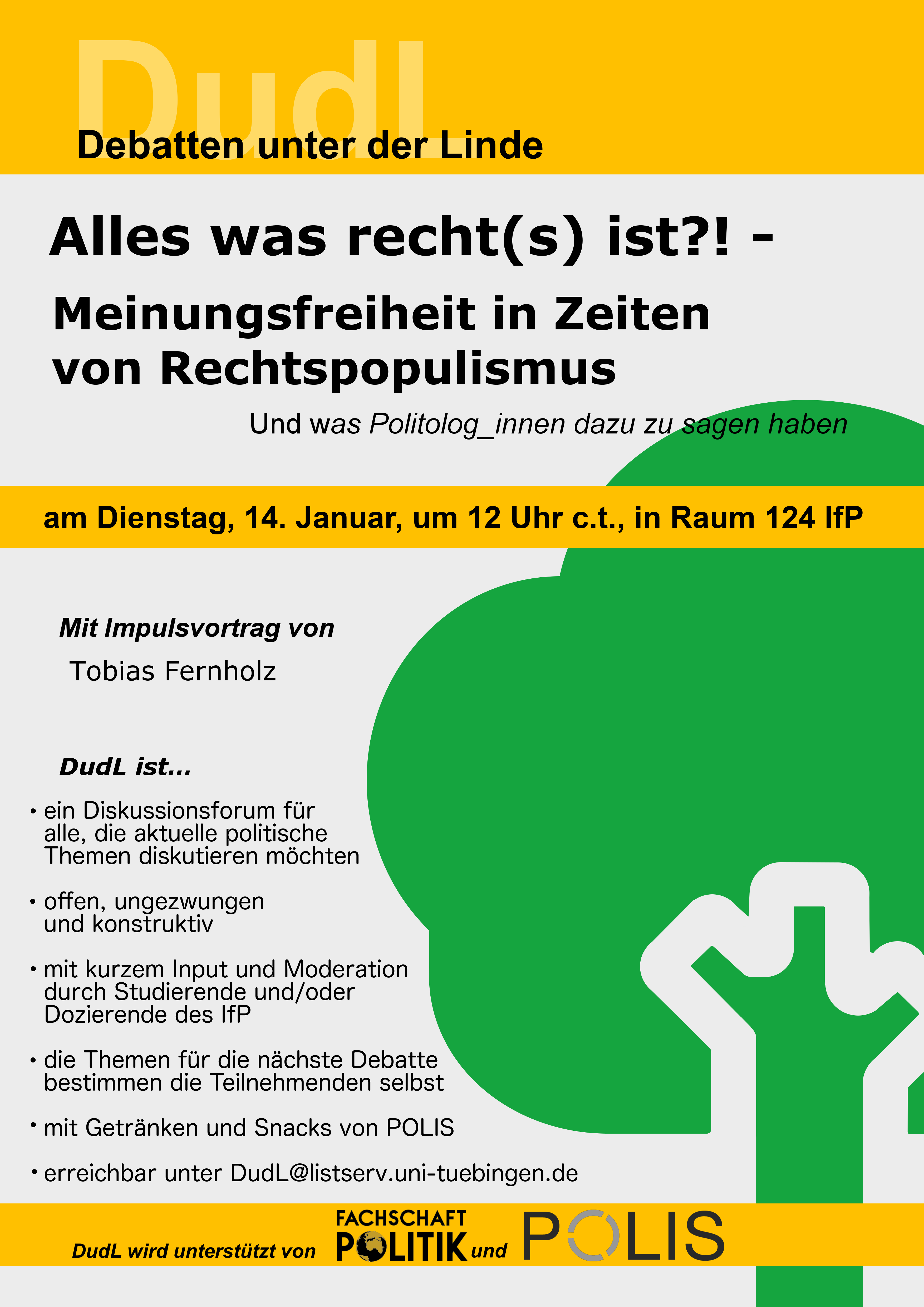 —– english below —– DudL am Dienstag, 25.07.23, 12 Uhr c.t., unter der Linde vor dem IfP und bei schlechtem Wetter im Raum 124 Nach unserem sehr erfolgreichen DudL über LGBTIQ*-Rechte in Europa haben wir nun ein letztes DudL vor den Semesterferien für euch zum Thema „Demokratie in Gefahr. Rechtsextremismus Weiterlesen…