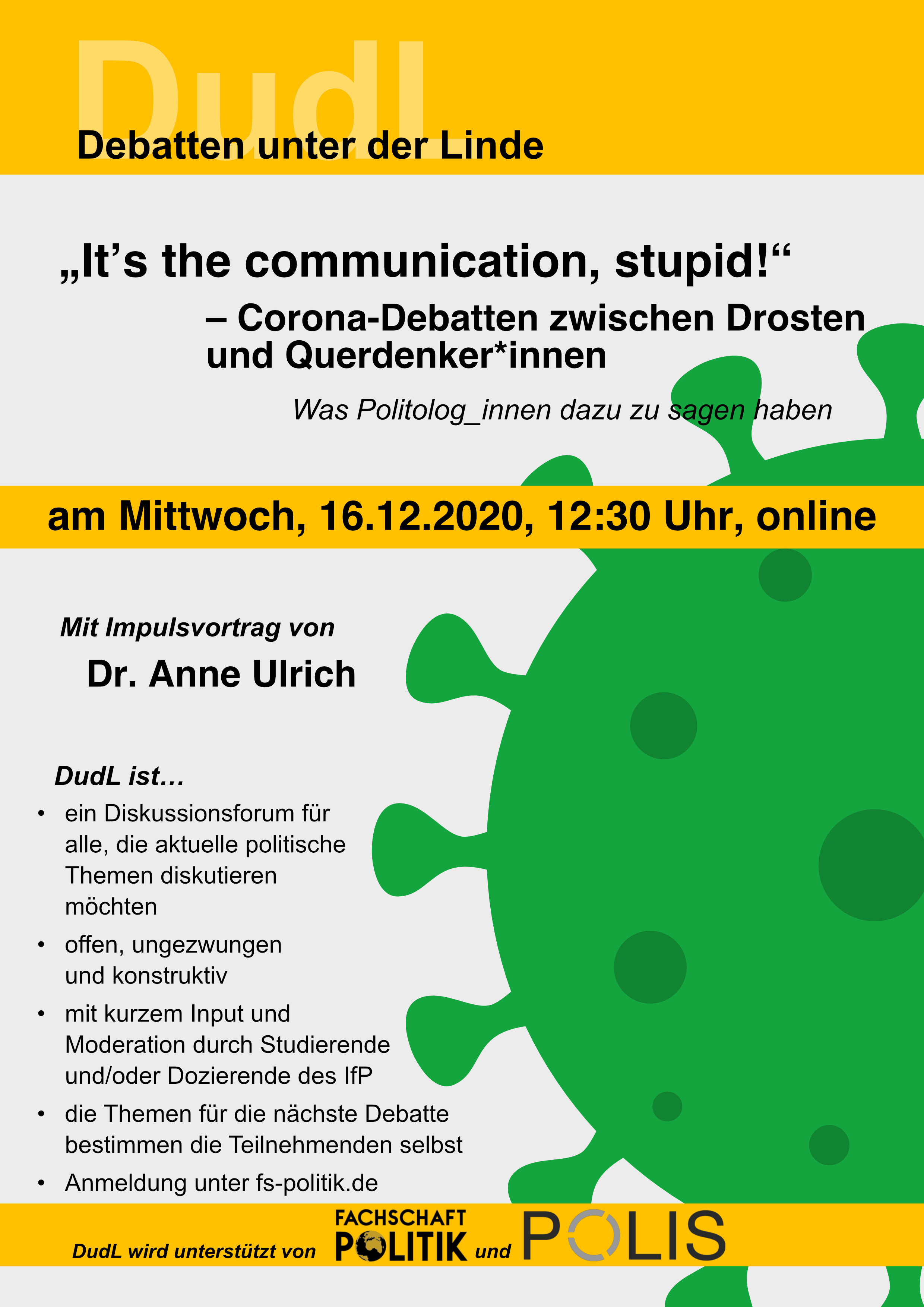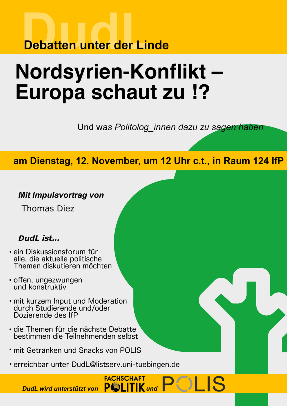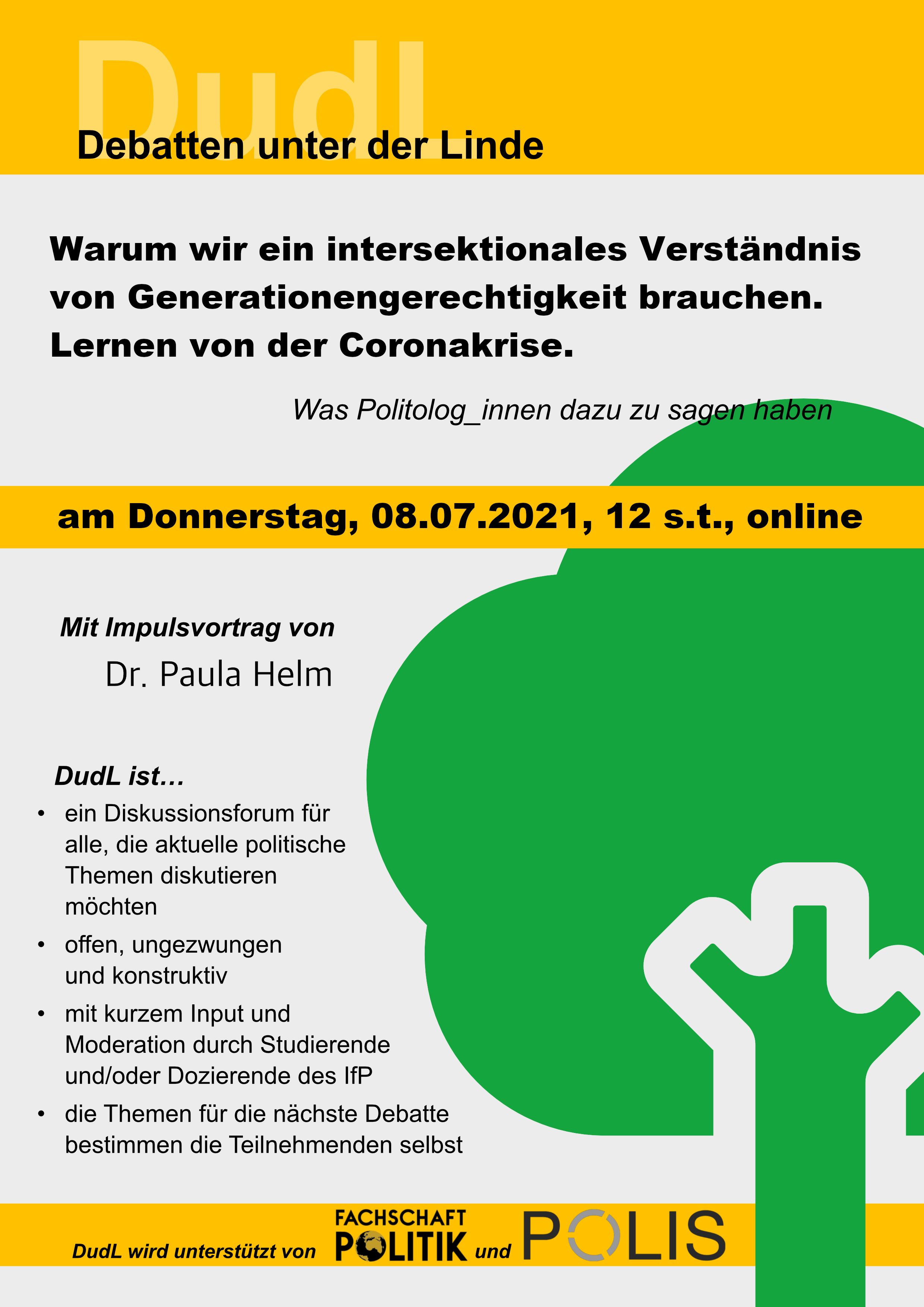 —– english below —– DudL am Dienstag, 25.07.23, 12 Uhr c.t., unter der Linde vor dem IfP und bei schlechtem Wetter im Raum 124 Nach unserem sehr erfolgreichen DudL über LGBTIQ*-Rechte in Europa haben wir nun ein letztes DudL vor den Semesterferien für euch zum Thema „Demokratie in Gefahr. Rechtsextremismus Weiterlesen…